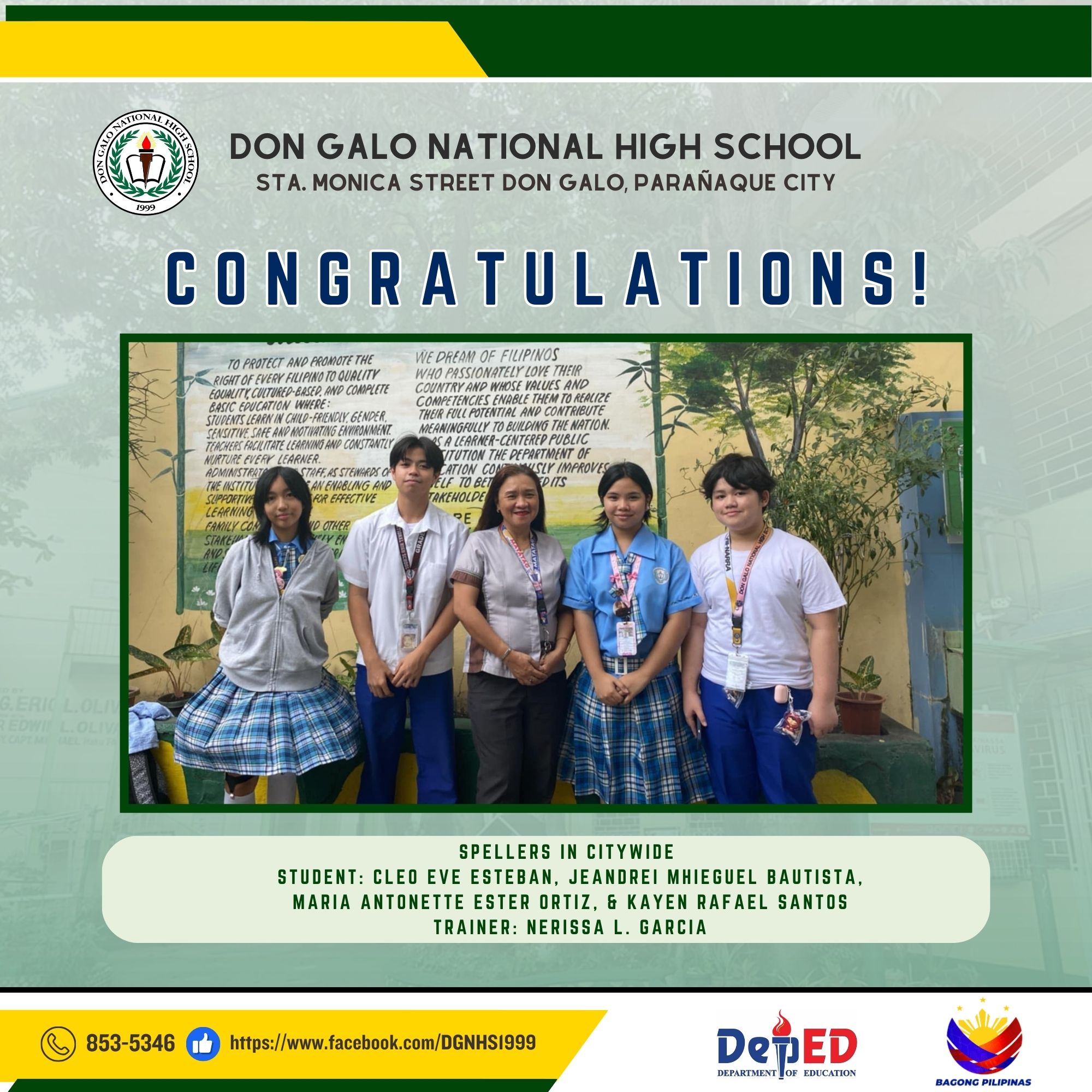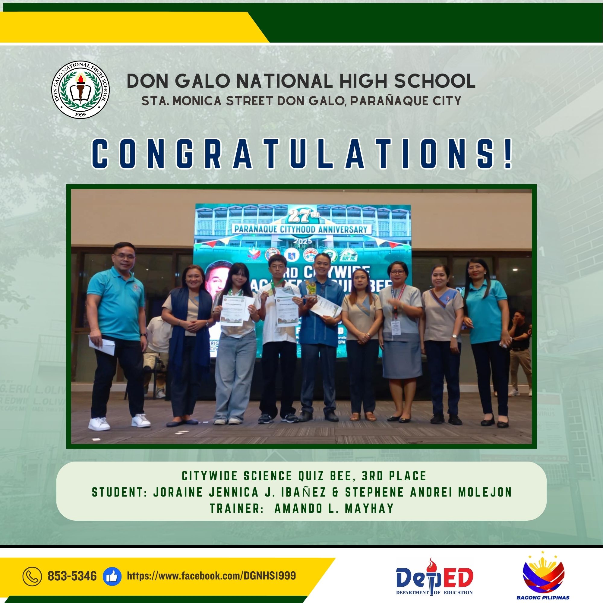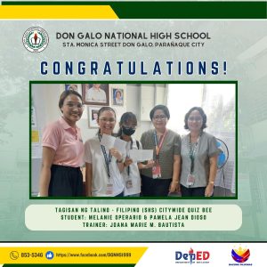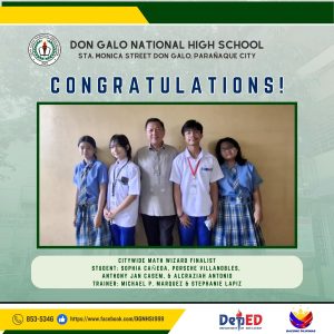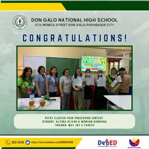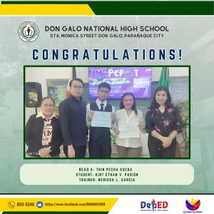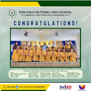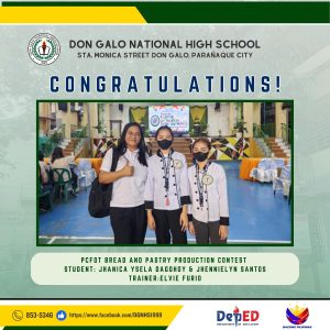Don Galo National High School proudly recognizes the outstanding achievements of its students in various academic and skill-based competitions. Congratulations to all the participants, trainers, and winners for their dedication and hard work!